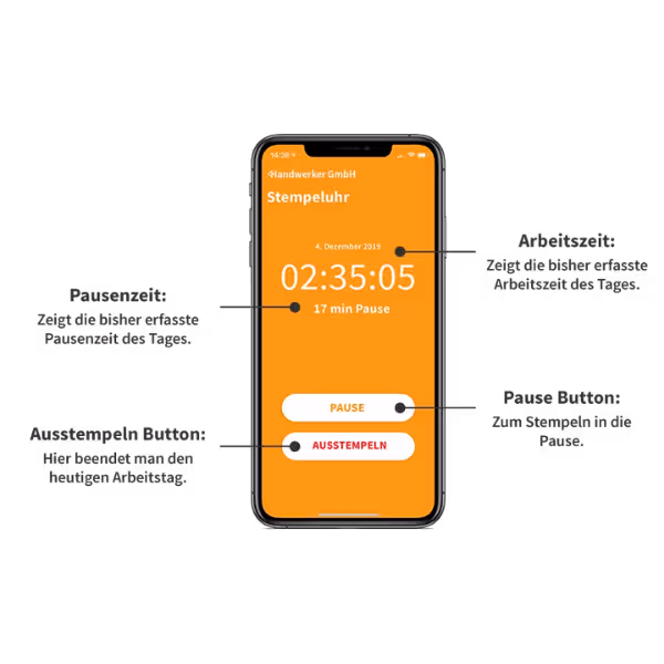 Unsere Zeiterfassung ist nicht kompliziert, sondern sehr einfach zu verstehen und selbsterklärend - im Endeffekt muss man nur auf Ein- und Ausstempeln drücken. Alternativ bieten wir auch ein Terminal zur Zeiterfassung an, bei dem alle Mitarbeiter gemeinsam an einem Gerät Zeiten erfassen können. Einen automatischen Pausenabzug gibt es ebenfalls.